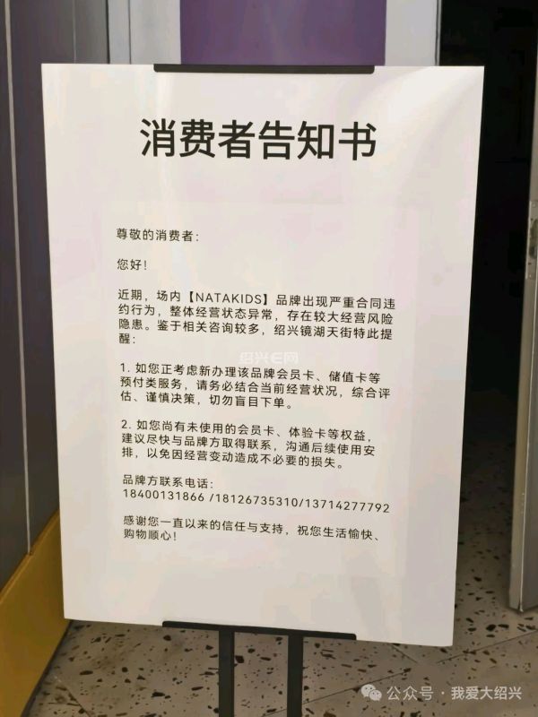 近日,绍兴镜湖天街发布提醒,称商场内的一入驻商家【NATA KIDS】品牌出现严重合同违约行为,整体经营状态异常,存在较大经营风险隐患。鉴于相关咨询较多,绍兴镜湖天街提醒消费者切勿盲目下单。