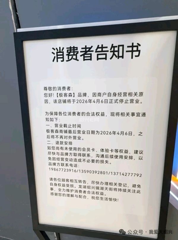 此外还有网友向我们爆料说,同是在该商场的商家【极客森】品牌,也因商户自身经营相关原因,该店铺将于2026年4月6日正式停止营业,镜湖天街也发布了告消费者书,会员卡还有余额的赶紧去联系商家。