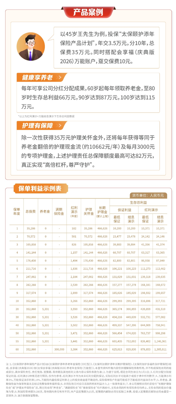 以深刻的客户需求洞察为基,“颐护添年”保障计划应运而生。该保障计划由“颐护添年分红养老年金+附加长期护理险”、“附加护身福终身护理险”构成,年金险与护理险的组合配置实现了“健康时增值、护理时防御”的双重功能。