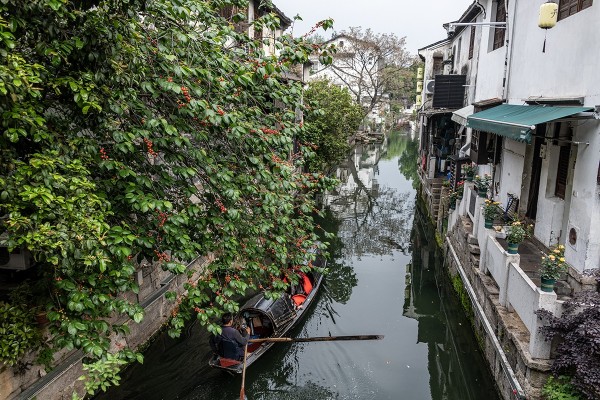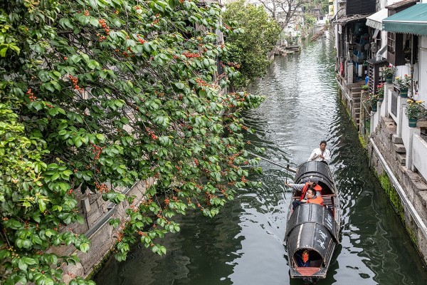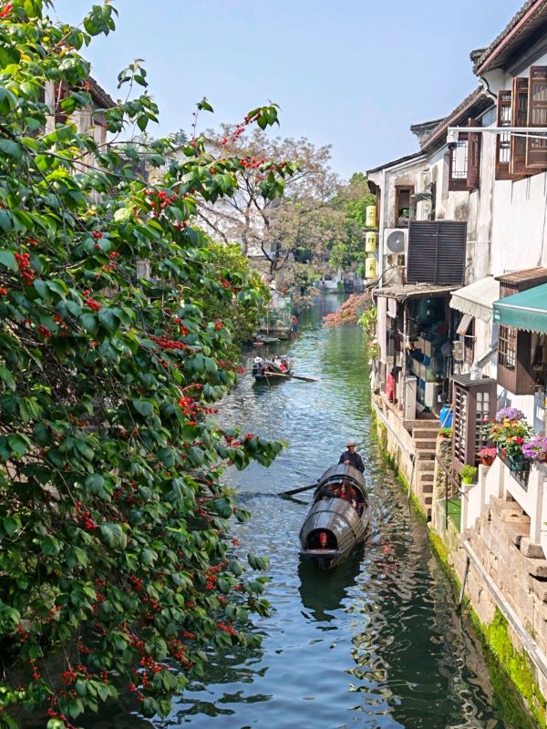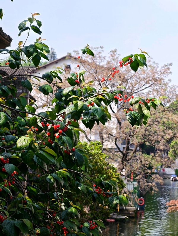 近日网红打卡地府桥头的红樱桃,府桥头的樱桃树长在小桥流水人家的庭院里已有近40年树龄,这里不是“枯藤老树昏鸦”,而是生机蓬勃四周游客如织的热闹景象,从仓桥直街环山河的乌逢船缓缓驶过这樱桃树下时船上的游客会情不自禁地伸出手来。