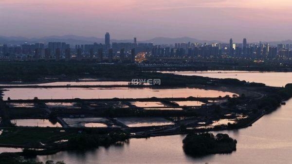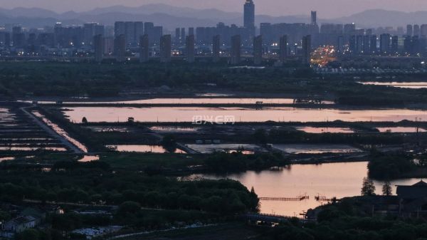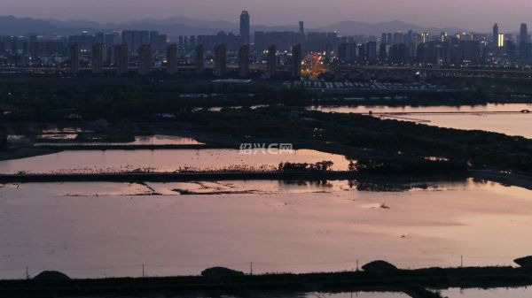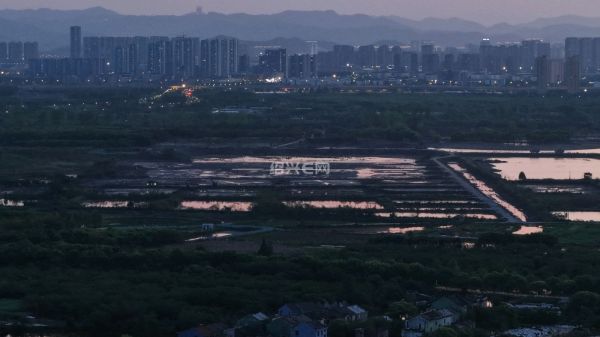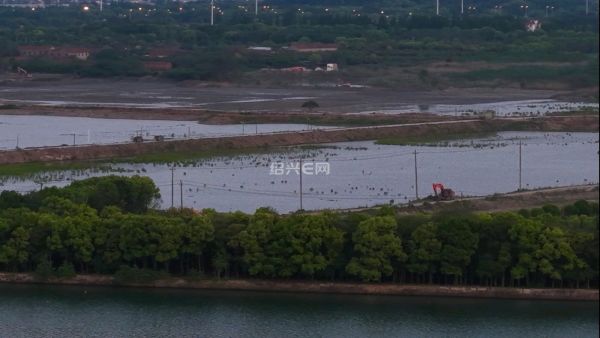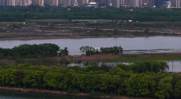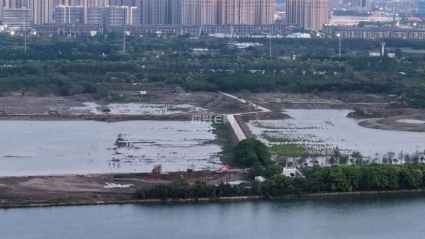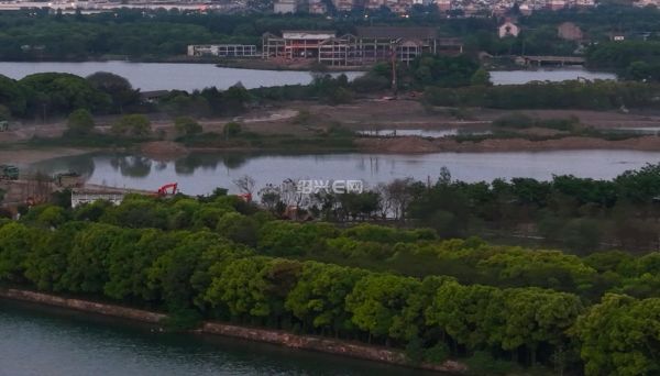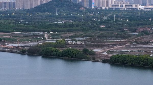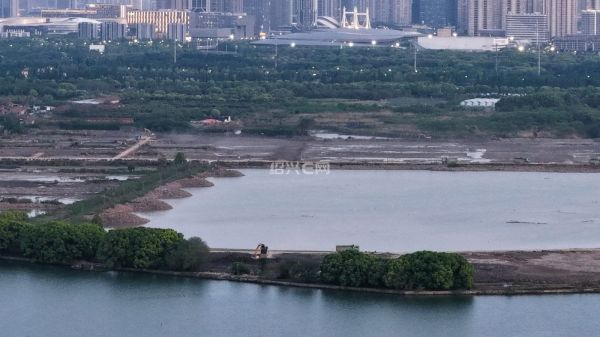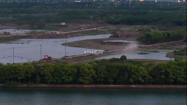 航拍落日前的犭央犭茶湖南湖工地,虽然已经是傍晚时分,但工程车已旧在装运河泥,仍是一片繁忙景象。