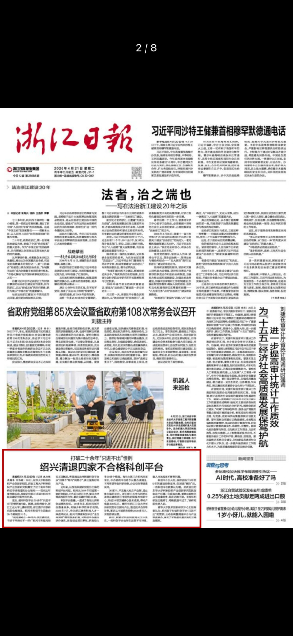 东华大学柯桥纺织产业创新研究院、西安工程大学柯桥纺织产业创新研究院、浙江工业大学上虞研究院、浙江数字内容研究院等四家不合格科创平台被清退