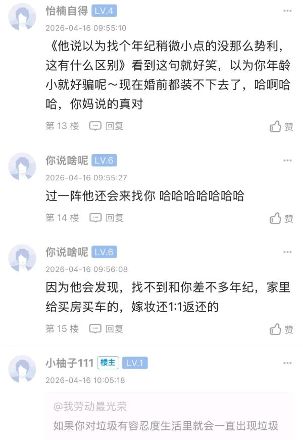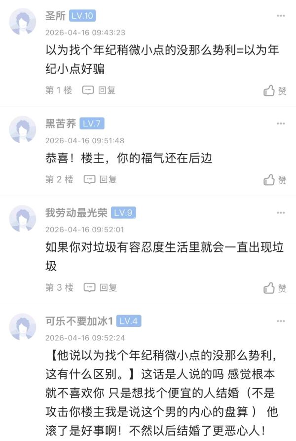 真的太离谱了。这男的。我妈知道后,说什么势利不势利的,他觉得我年纪小找我,是觉得我年纪小好骗!这种人太下作了,还好分手了。
