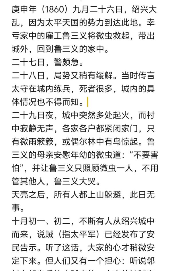那时期绍兴有个文人,写了小虫日记,就描写了如何逃出绍兴城,如何逃难的,包村的血雨腥风