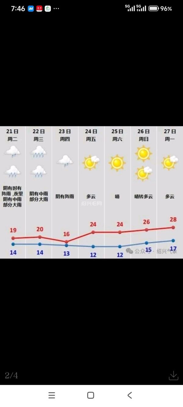 据绍兴市气象台发布:今天阴有中雨,明天阴有阵雨,傍晚雨渐止转阴。