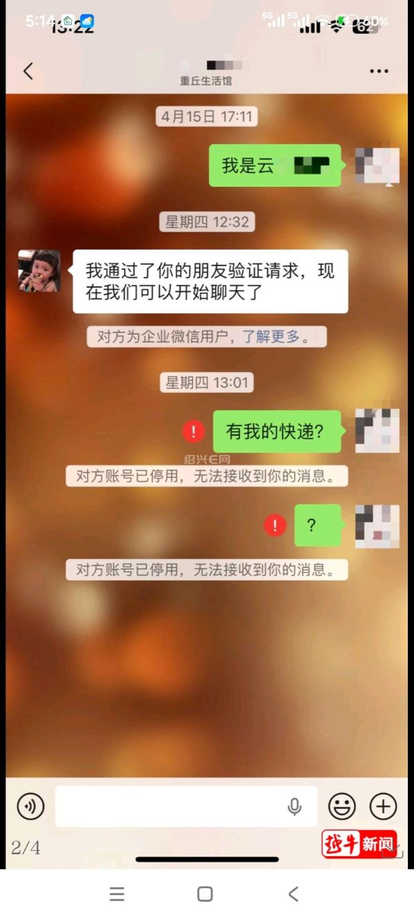 当天下午云女士扫码添加了该企业微信,隔日中午通过验证后,云女士试图询问快递情况,却发现消息对话框弹窗红色感叹号,微信显示“对方账号已停用,无法接收到你的消息”。