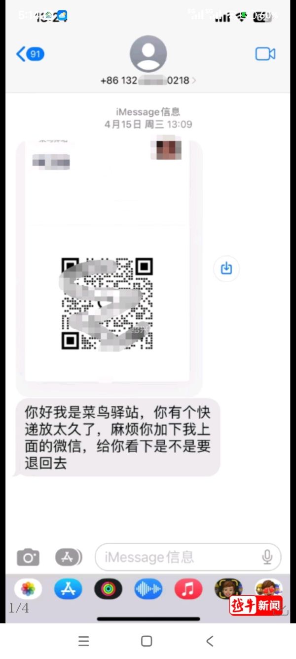 4月15日,市民云女士收到两条iMessage信息,对方发来一张企业微信二维码,后续文字消息显示:你好我是菜鸟驿站,你有个快递放太久了,麻烦你加下我上面的微信,给你看下是不是要退回去……