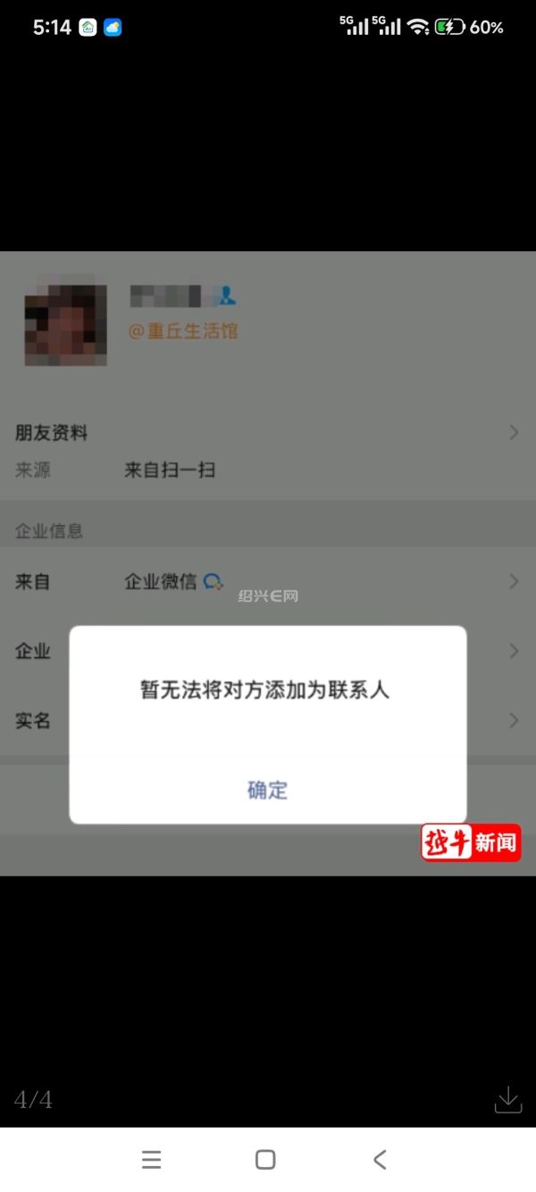 此外,扫该企业微信二维码时,弹窗提醒“暂无法将对方添加为联系人”。