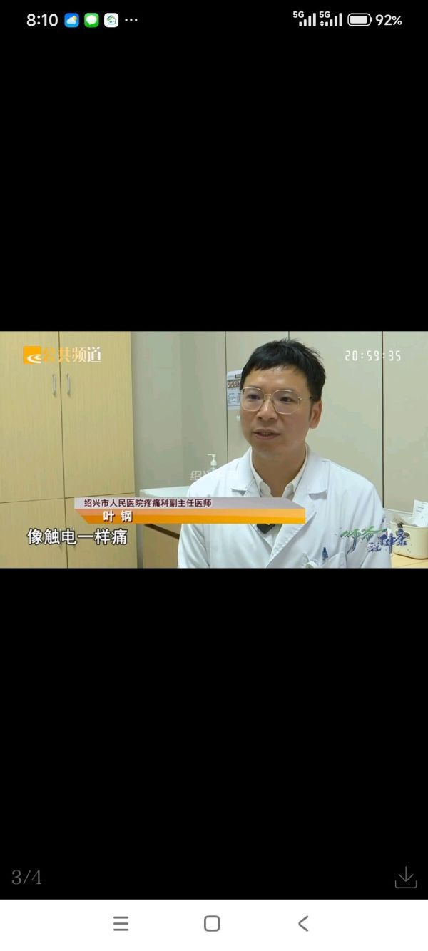 绍兴市人民医院疼痛科副主任医师 叶钢:一部分人是主诉疼痛来的。比如说胸背部、腰腹部不明原因的刺痛,像触电一样痛,这种就是初期以疼痛为首发症状来看的。0116 但是你说老人年人免疫力低下的人,确实针对带状疱疹这个毛病。可怕的是它的后遗神经痛。那你说后遗神经痛一旦发生。有些人是数月,有些人是数年,甚至是终身的。衣服蹭一下就痛,不敢穿衣,不敢脱衣,不敢触碰,非常影响生活质量。