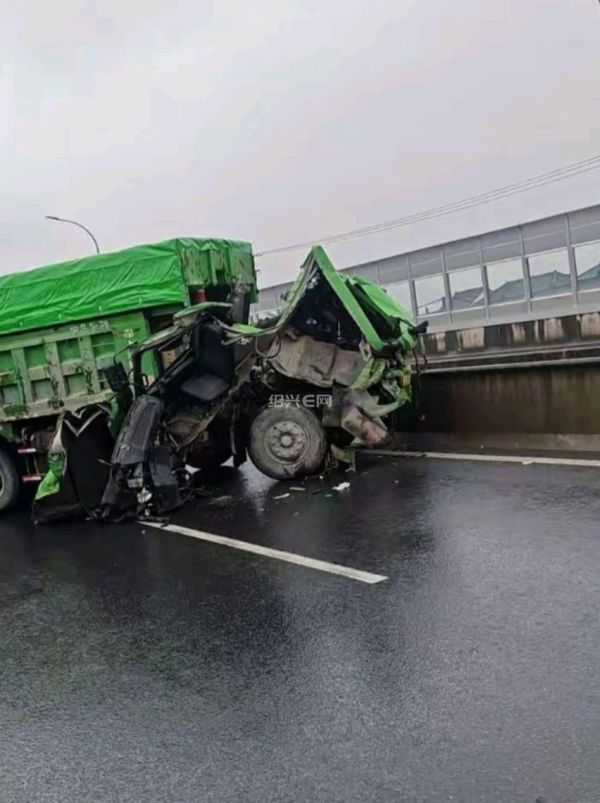 齐贤方向一辆大货车撞倒护栏车头都凹进去了