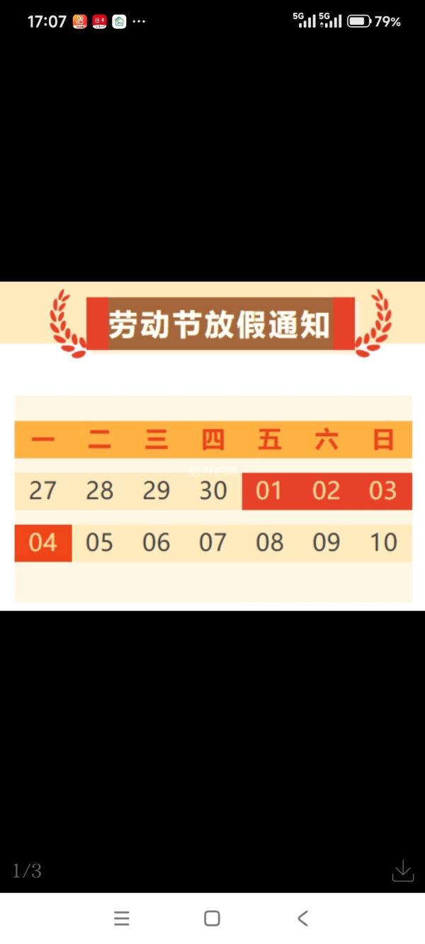 放假时间说明:5月1日(星期五)至5月4日(星期一)放假调休,共4天。