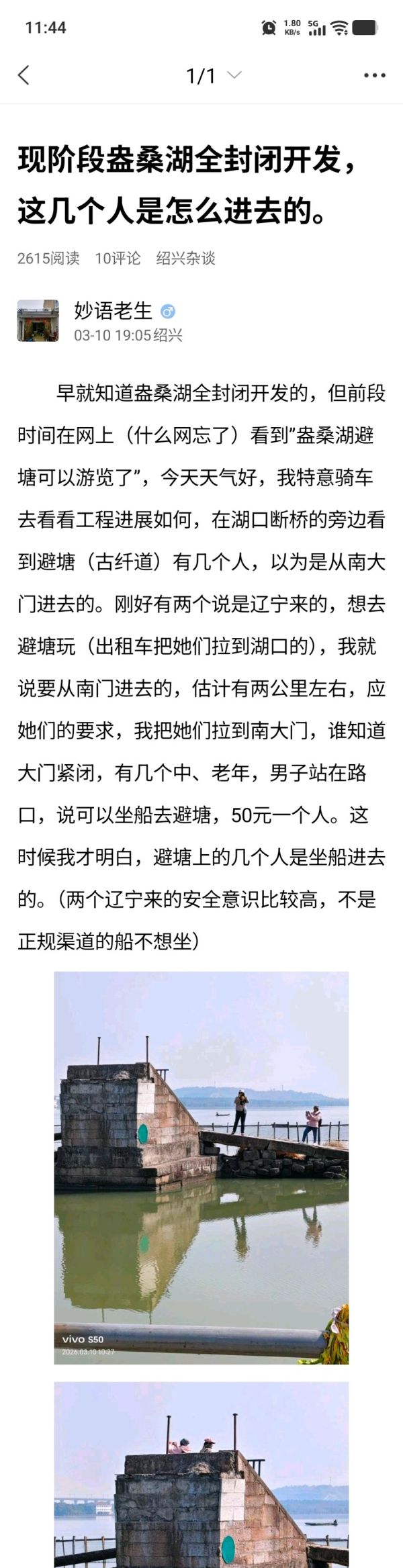 随后,记者咨询了现场负责管控施工区域车辆、人员进出的工作人员。该工作人员表示:“犭央犭茶湖目前处于全面封闭施工状态,绝对走不进去。网上流传的那些乘船攻略,涉及的都是非法营运船只。如果游客想观赏古纤道,沿环湖路行走就能远距离看到。”