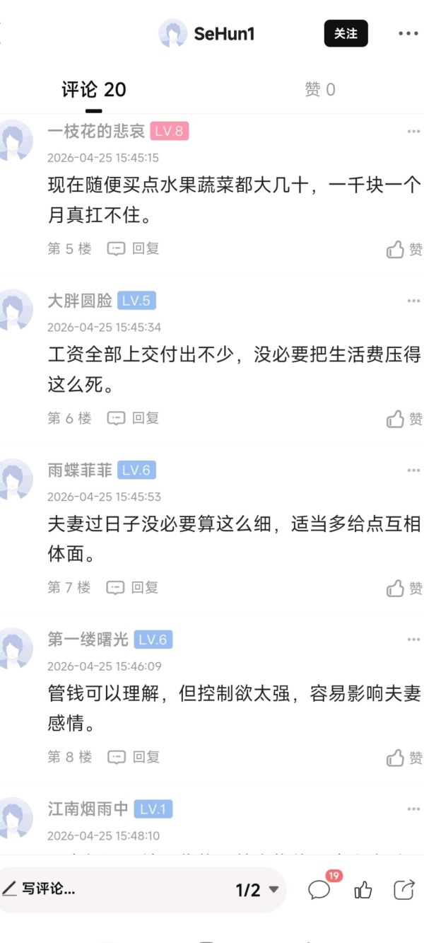 ?婚后老公工资上交,每月给一千生活费算多还是算少?