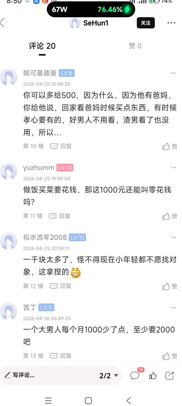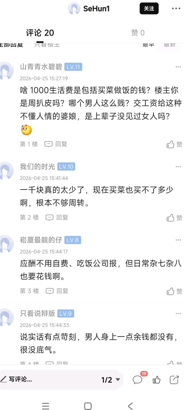 我是女的,如果老公每个月这样给我1000,我要疯的,结什么婚,单身更好。为什么反过来是男的就觉得正常了???