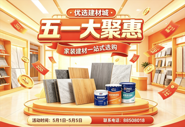 劳动创造世界,奋斗成就伟业。值此五一国际劳动节来临之际,建材城为回馈广大市民朋友多年来的关心和支持,特举办五一大聚惠活动,为有装修、置换家居用品需求的朋友带去实实在在的优惠。