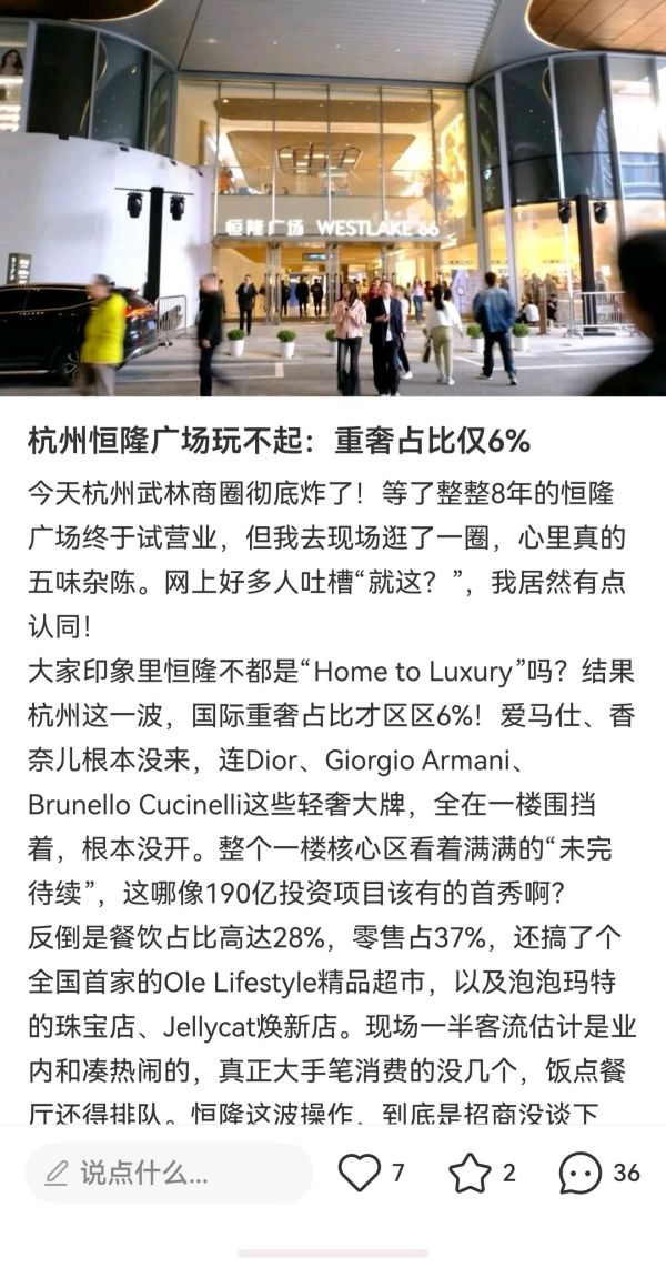 杭州恒隆广场昨天开业 品牌和之前吹的差了好几个档次 不仅重奢一个没来 连最近爆火的始祖鸟 老铺黄金都没 让人大跌眼镜。 苏宁不官宣品牌 缩减品牌数量 是不是有重蹈杭州恒隆广场的前兆,恒隆广场也是开业前几天才公布品牌,且开业有大面积的围挡 没法开业 ,两个项目都是公认的好位置 都是经历了很多年才开业,据传苏宁广场的内部进度比恒隆广场还要慢,618那天会不会让人大跌眼镜。