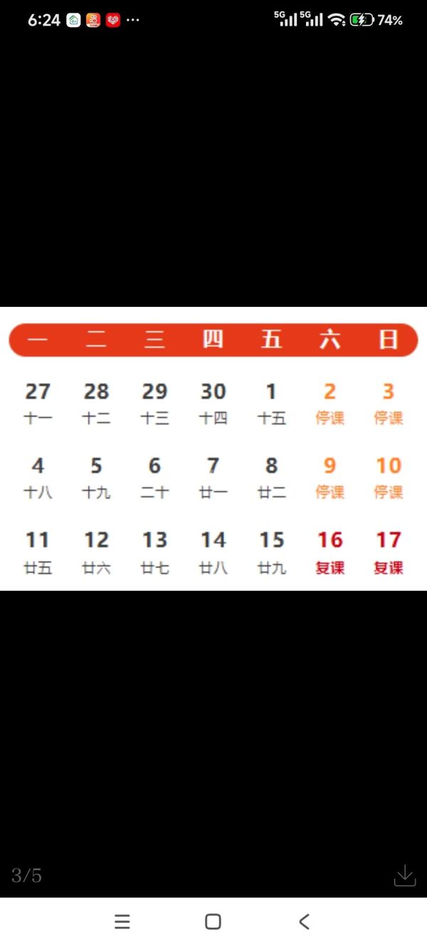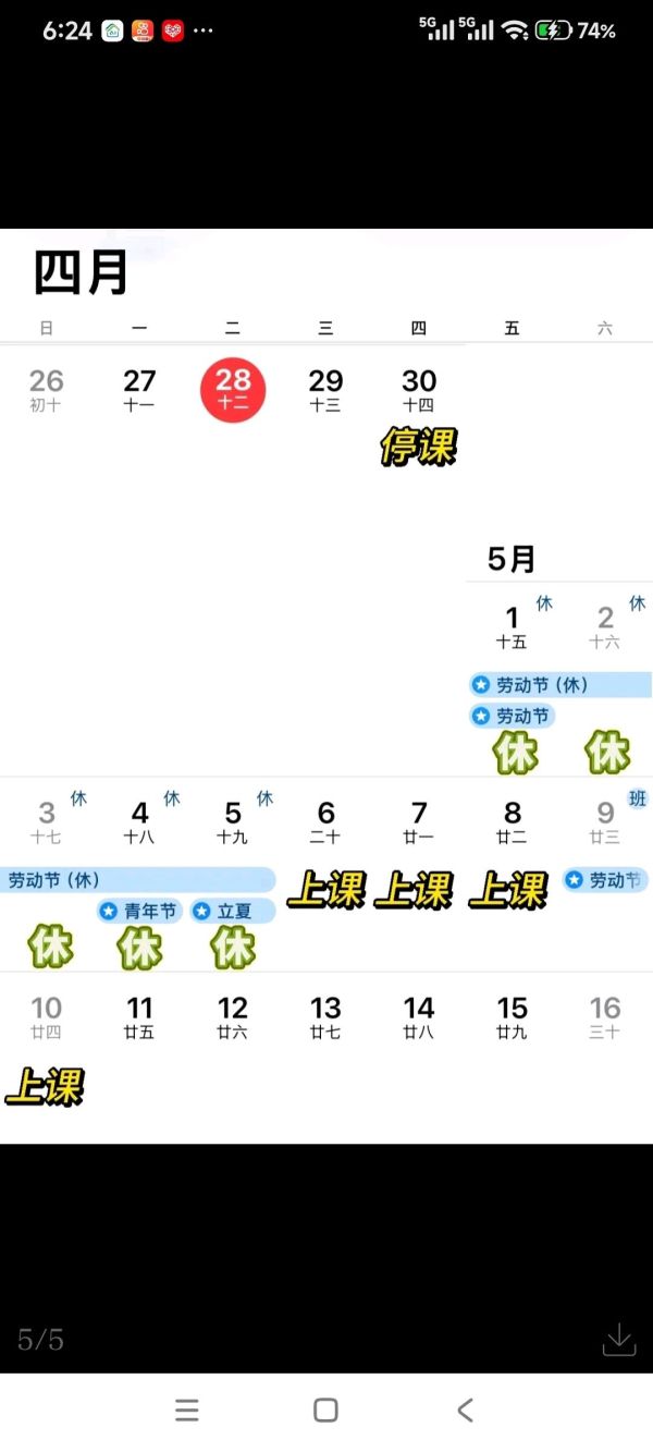5月1日(周五)至5日(周二)共5天,劳动节放假,不上课。