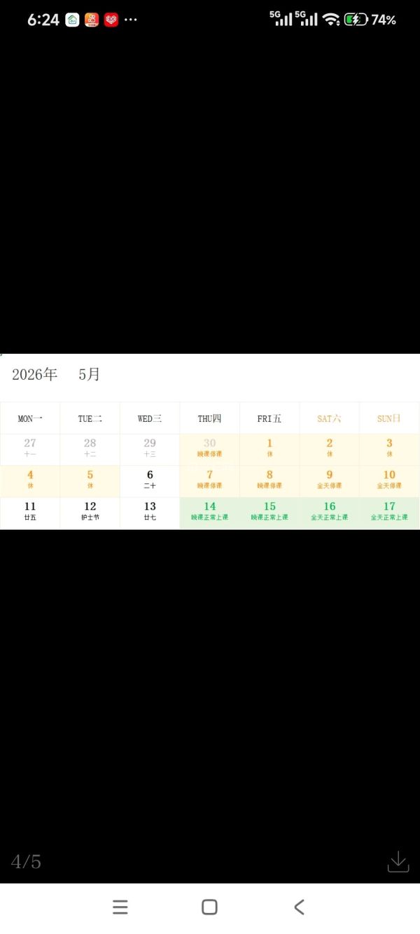 5月1日(周五)至5月5日(周二)为劳动节假期,所有课程全部停课;