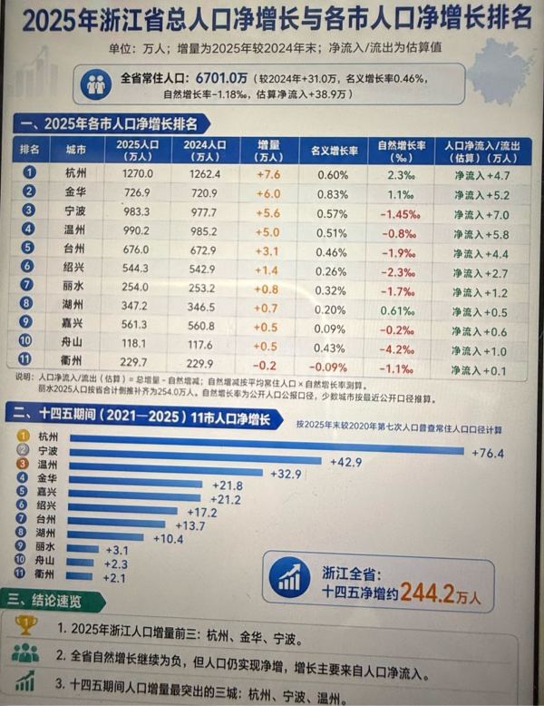 没有交通枢纽的城市,人口是极难增长的,不被吸不减少已经算成功。浙江有四个交通枢纽,杭甬温义,义乌一个县级市的高铁站仅次于杭州东站。